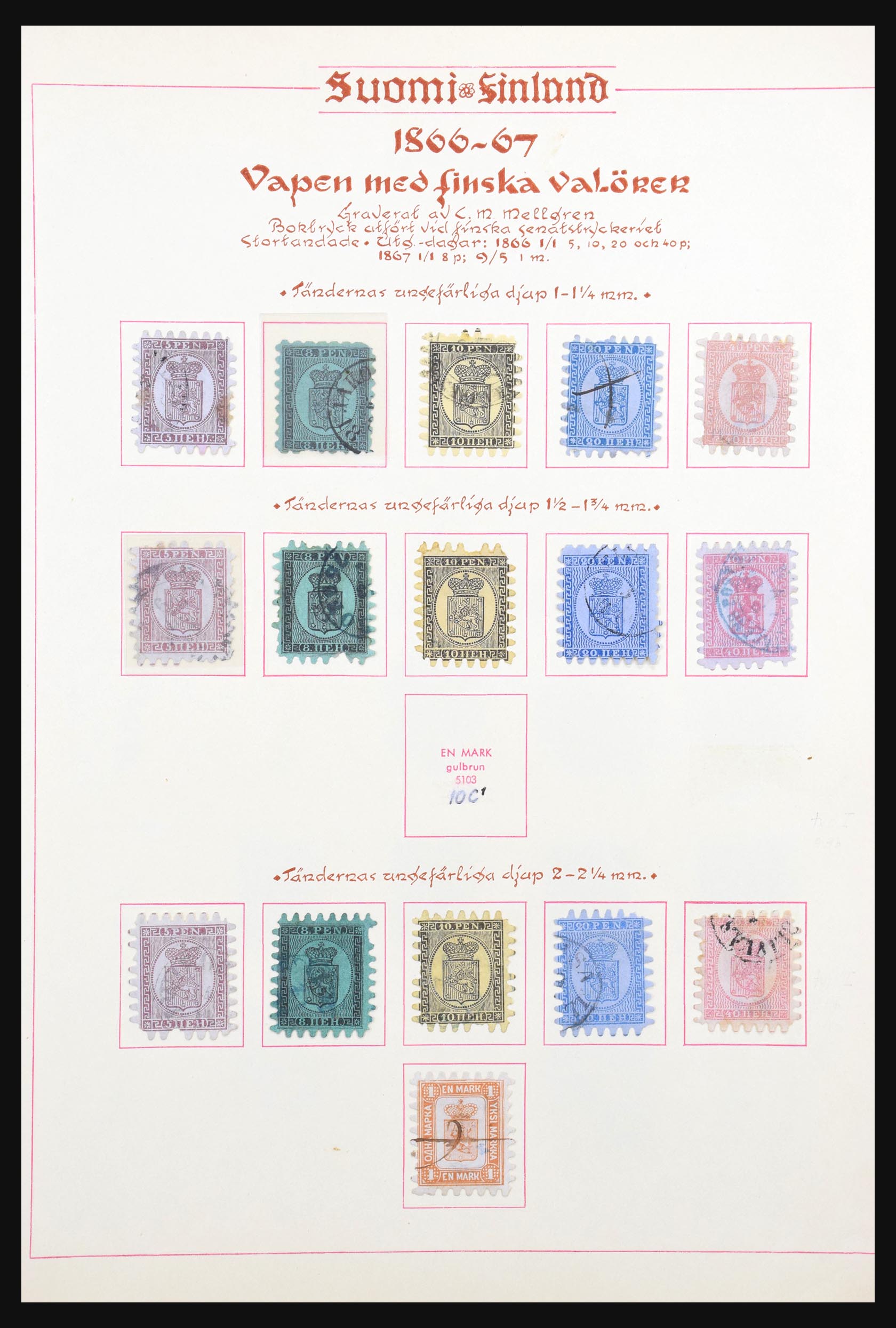 Well filled, mostly used stamp collection Finland 1856-1974 in old album, in which e.g. (Michel no’s): 2, 5-10 in various perfs, 60, 131* (Zeppelin overprint), military stamps 8, auto parecelpost stamps 1-5**, 6-9, etc.