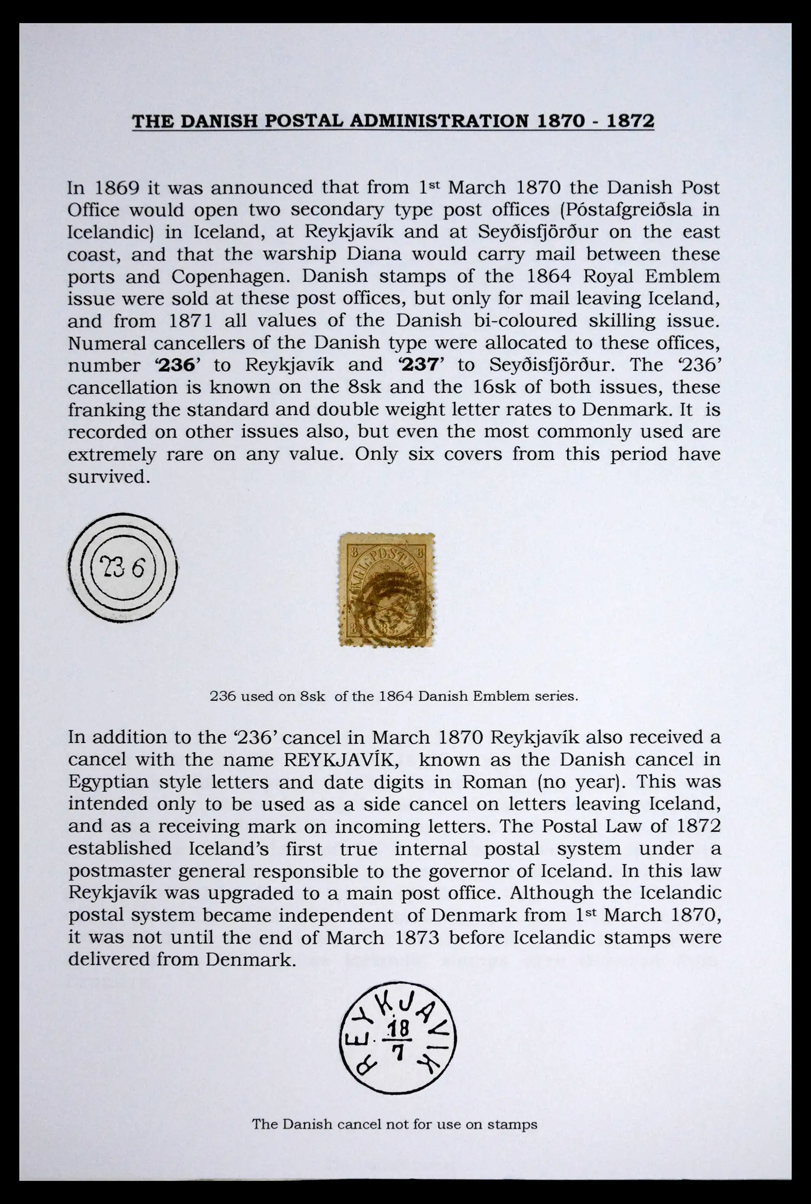 Very interesting collection in two albums with several early stamps with postmarks, some very rare. E.g. numeral “236” on 8 sk. Denmark Coat of Arms and 3 & 40 aurar, rare crown canc. type 2 on 3 aur. Further many good covers with good frankings, cancellations etc. housed in 2 albums with descriptions. Great collection, very pretty!
