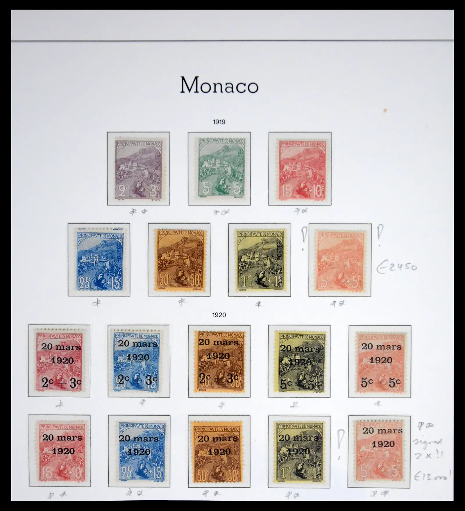 The rare 1919 orphelin set 2c to 5 franc fresh mint hinged/mnh (including 5 franc fresh mint never hinged!!), also the very, very rare 1920 overprint set 2c to 5fr fresh mint/mnh (1fr mnh, 5 franc mint never hinged signed 2x!!! Cat. value alone 13.000 EURO!!!), on albumpage. Yvert catalogue value over 17.000 EURO!!! Missing in nearly all collections !! Very seldom offered!!!