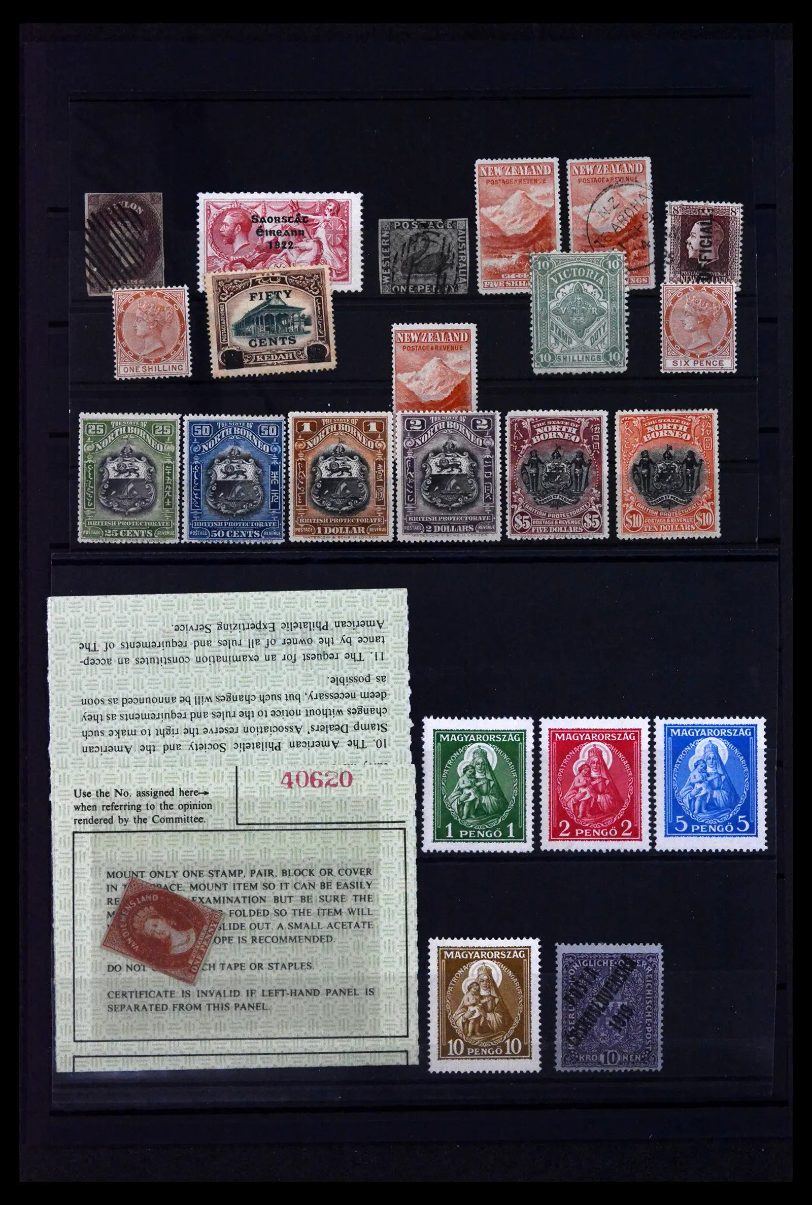 A small but powerful selection of stamps including the following by Scott number unless otherwise noted: used Ceylon #6A, New Zealand 83, O51, Western Australia 1, and unused Czechoslovakia B21 (signed Bloch), Hungary 462-65, Ireland 78b, Kedah 21, New Zealand 83 (2), North Borneo 152-57, Tobago SG 23a & 24c, Victoria AR11, and Tasmania 7, a very rare stamp albeit with faults but with an APS certificate, overall Fine to Very Fine,