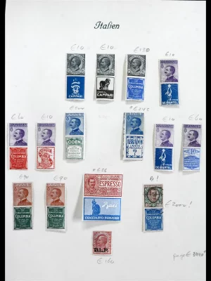 £250Mint and used collection of stamps with advertising labels, values from 15c to 1 lire, many better including 25c with Coen mint (cat. 500 euro), 1 lire used with Columbia (cat. 2000 euro!!) etc. on albumpage. Sassone total catalogue value over 3400 euro!