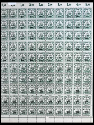 £1,250Incredible complete mint never hinged sheet of the 10 on 5 pf green (missing left sheetmargin, some tone spots) with types I, II and III together, platefaults (broken 1 for example), several stamps with major shift of overprint to the top, HAN number, rare offer. Catalogue value 6000+++ EURO!!