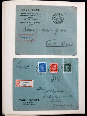 £1,200Comprehensive collection covers, with many better, expensive frankings, special cancels, lots of zeppelin mail, censorship, field post, blocs (also on cover), FDC’s and a very fine crash mail cover, on blank album pages in spring back album. Also with some Austria.