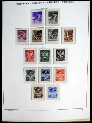 £500Mint hinged and used, partly double stamp collection Indonesia 1948-1977, in which overprint set 1949, both mint hinged and used, temple set 1950, mint hinged and used, Ris overprints 1950 both mint hinged (few small values are missing) and used, Riau overprints (mint hinged) etc. in blank album. Super bargain!!