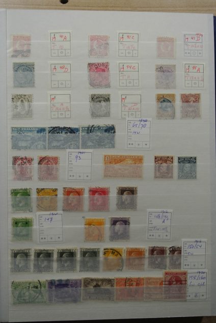 Nice, MNH, mint hinged and used stock New Zealand 1870-1994 in 2 stockbooks. Lot contains much material including better like (Michel no’s): 160*, 155-160, 184*, 186*, 206-208**, 344**, 345**, 409**, 411**, 412**, service 9, life insurance 25-32** (2x), 33-38** (2x), further many Health sheetlets and better souvenir sheets like 14 I**, 23B**, 30**, 30, 32 I**, etc. Bargain!
