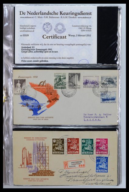 Complete collection of first day envelopes from the Netherlands 1950-2014, including E1 with certificate, E2, E3, E4, E5 etc. in 7 FDC albums. From E35 almost all unaddressed, catalogue value over 10,500 euros.